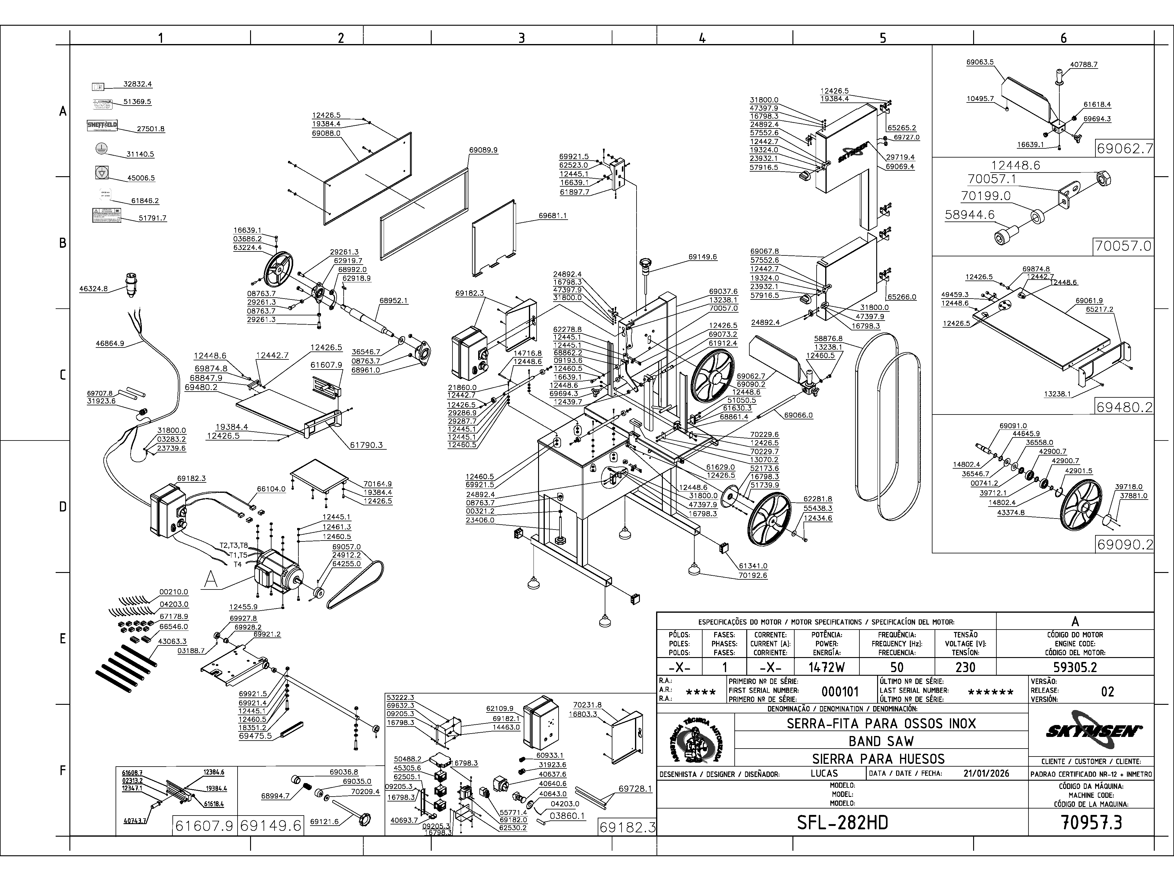 BAND SAW, STAINLESS STEEL, WITH PUSHER, MOVABLE TABLE, COMPLETE CUT REGULATOR, BLADE 2.820 mm / 111", HEAVY DUTY