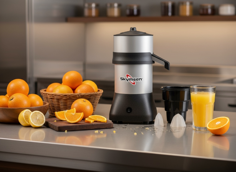 The EX Citrus Juicer comes complete with everything you need to start. It includes a large crown for oranges and a small crown for lemons, ensuring versatility for various citrus fruits. A cup and sieve are also included. Now, for even greater convenience and cleanliness, it features a splash blocker (included), keeping your workspace tidy. This durable and powerful equipment is a smart investment for consistent, high-quality juice production.