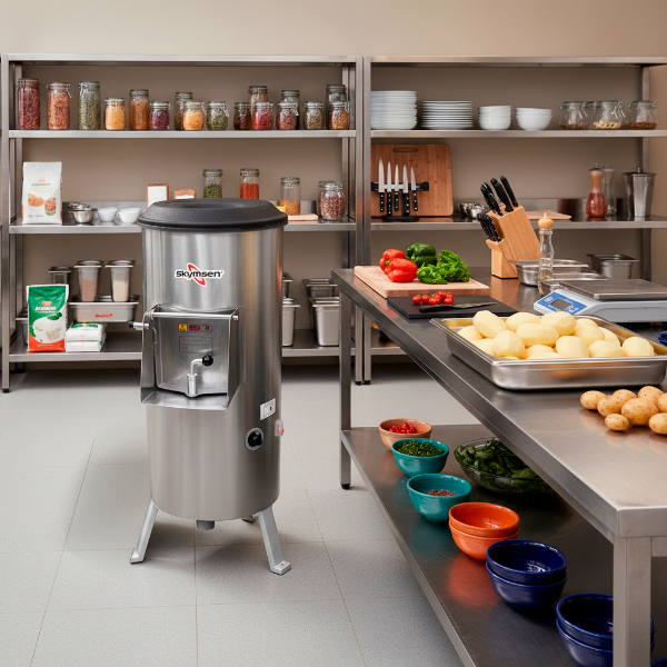 The Skymsen DB-25HD Potato Peeler is a heavy-duty, high-performance solution designed for the most demanding commercial kitchens. With a robust 25 kg capacity, this stainless steel peeler achieves an impressive productivity of up to 500 kg/h, drastically increasing your efficiency. Its reinforced stainless steel structure ensures exceptional durability, built to withstand continuous, high-volume operation. A standout feature is the integrated timer, allowing for precise control over the peeling process and optimizing production.