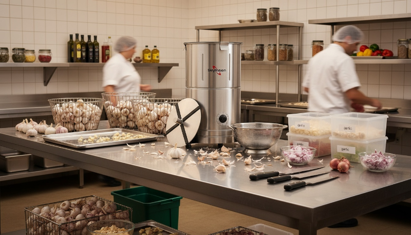 Optimize time in your kitchen with the Skymsen DAL-06S Garlic Peeler, a specialized stainless steel machine designed for efficient garlic processing. This peeler is ideal for preparing garlic for immediate use or for creating crushed garlic and pastes. It boasts a 4 kg per cycle capacity, with an impressive average output of 70 kg/h, significantly streamlining your kitchen workflow.
