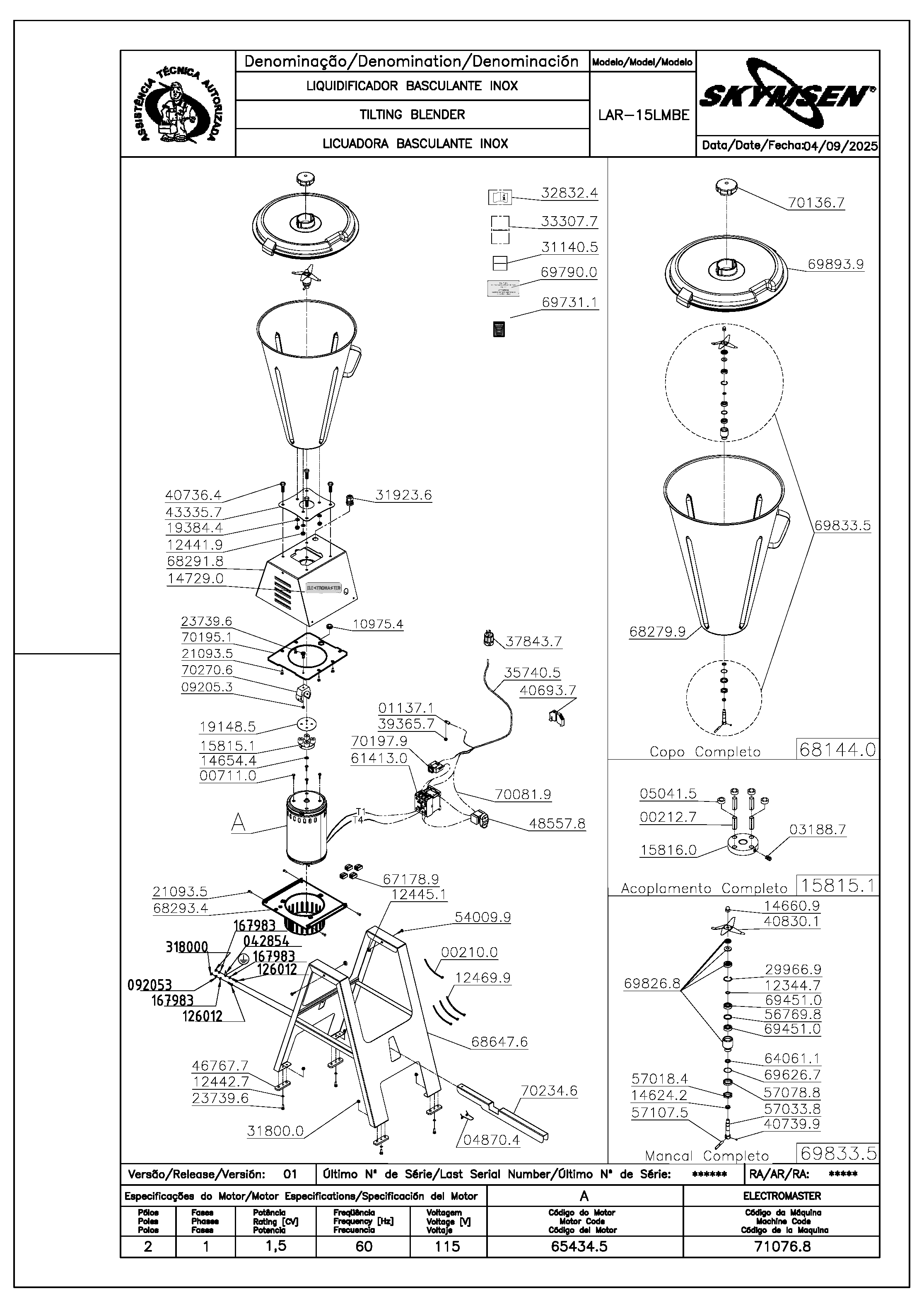 LICUADORA COMERCIAL, BASCULANTE, CABALLETE Y VASO MONOBLOQUE EN ACERO INOXIDABLE, 15 LITROS