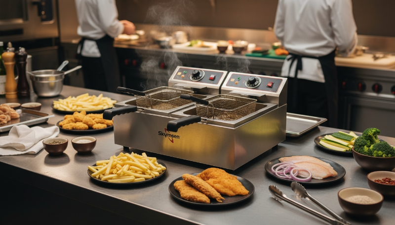 Maximice su capacidad de fritura con la Freidora Eléctrica FED-20-N, que cuenta con dos cubas de 5 litros cada una para entregar lotes continuos de papas fritas y crujientes. Esta robusta unidad es ideal para cocinas ocupadas, bares, cafeterías y food trucks, ofreciendo alta productividad con un uso eficiente de aceite y energía.