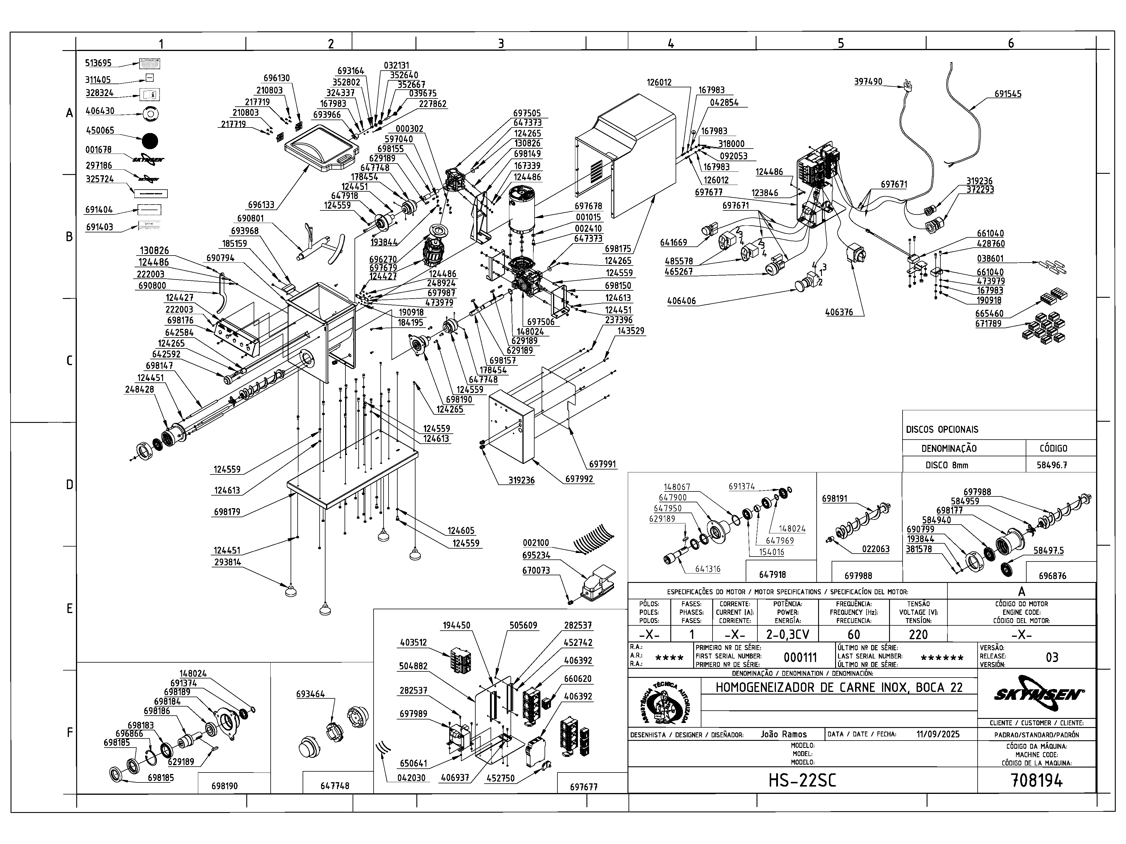 MOEDOR HOMOGENEIZADOR DE CARNE INOX, BOCA 22 INOX, SEM CAVALETE