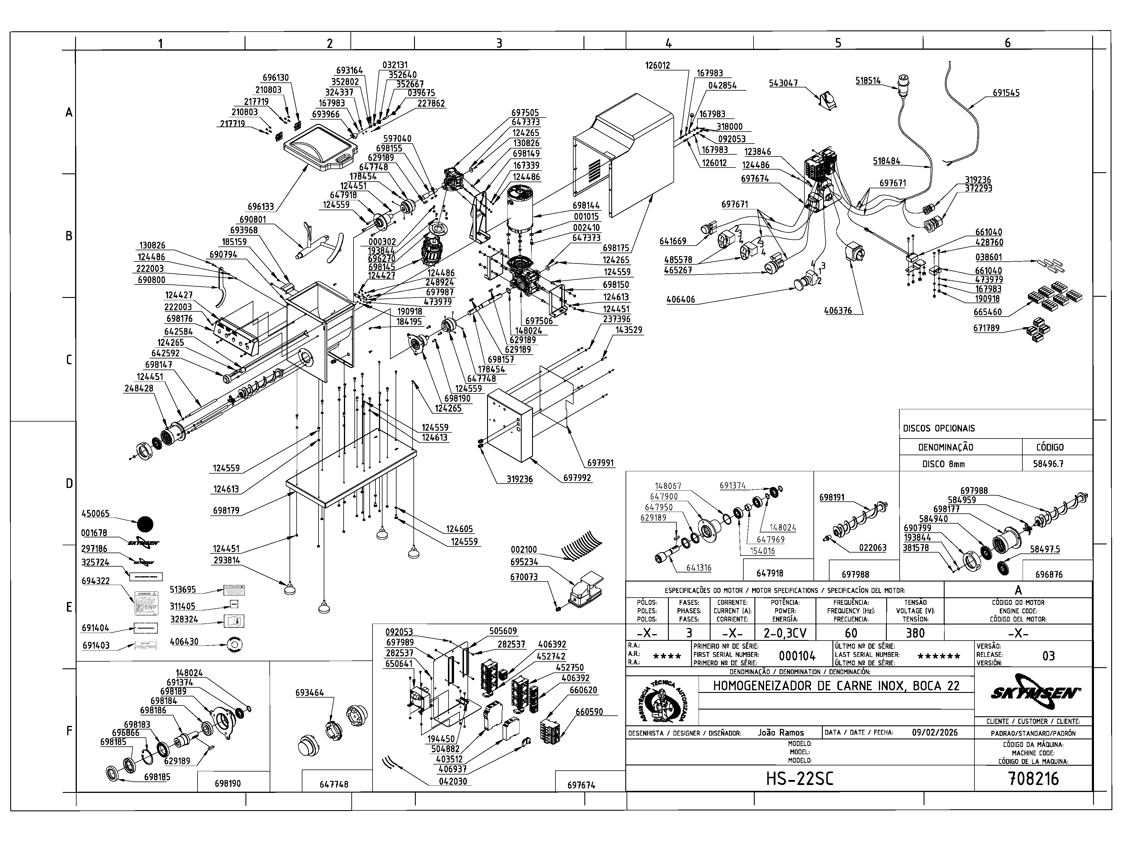 MOEDOR HOMOGENEIZADOR DE CARNE INOX, BOCA 22 INOX, SEM CAVALETE