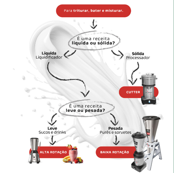 Um equipamento potente, com motor de 3 CV, apresenta força o suficiente para triturar gelo e produzir sucos através de polpas congeladas com muita facilidade e agilidade. Além disso, também pode ser utilizado na produção de receitas secas, triturando sementes, cascas e grãos dos mais variados tipos, o que é ideal para a produção de sopas, patês, purês e diversas outras receitas.