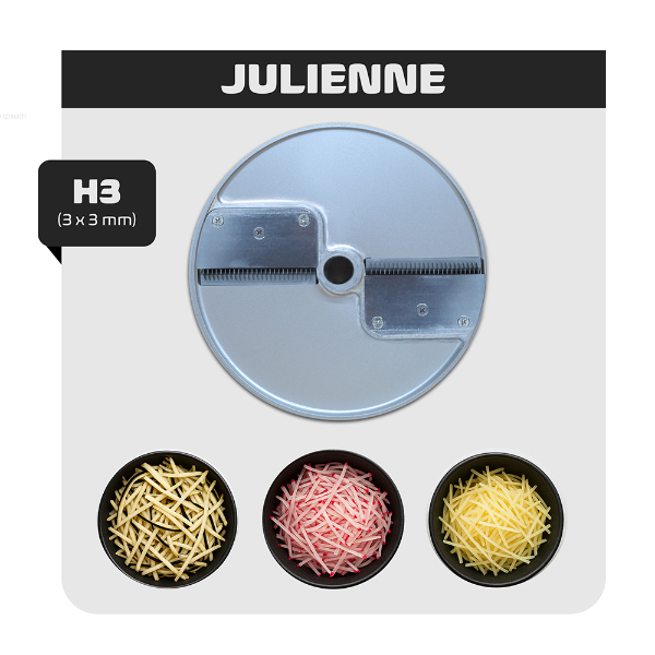 Transforme a sua preparação de pratos com o Disco H3, especializado em cortes Julienne de 3mm. Compatível com o PA7 PRO, este disco oferece precisão e rapidez, sendo indispensável para cozinhas que valorizam eficiência e produtividade.
